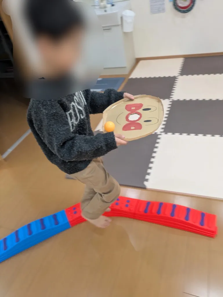 足元はバランス遊具の上。バランスを取りながら、さらにピンポン玉を落とさないように進むのはなかなかの難しさです。
