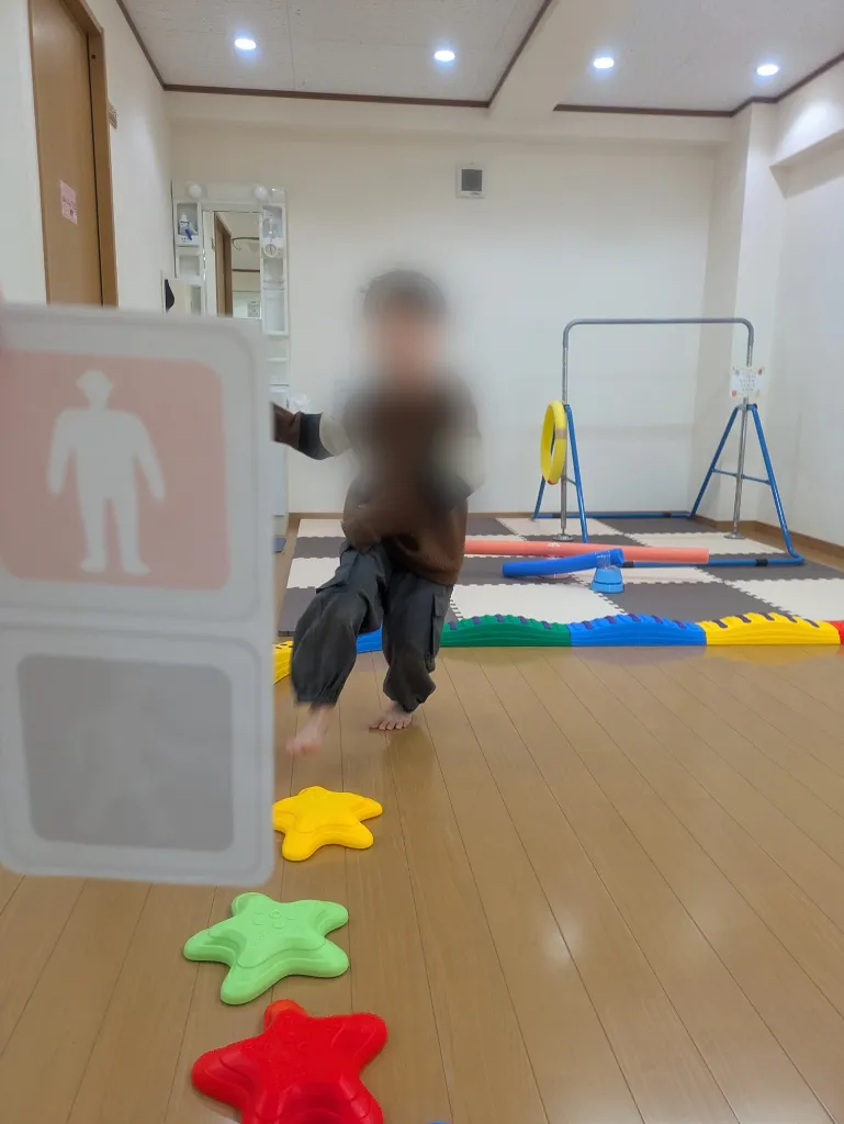 今回は床に星形のステップを並べたり、バランスコースを使ったりしながらゲームを行いました。子どもたちは信号カードをしっかり見ながら、バランスを取りつつ一歩ずつ進んでいきます。青信号で進み、赤信号でピタッと止まる姿はとても上手で、みんな集中して取り組んでいました。